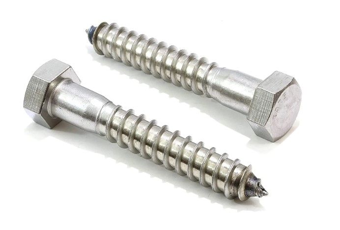 A full-bodied 18-8 stainless steel bolt with a hex head, spaced threads, and a gimlet point, mostly for use in wood applications.