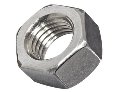 A six-sided internally threaded 18-8 stainless steel fastener which is both thicker and wider across the flats than a same-sized finished hex nut.